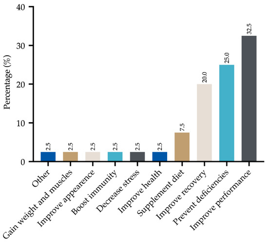 Nutritionists/dietitians were the main sources of information for the use of supplements (31.6%), followed by internet and teammates (15.8% for both), physicians (12.3%), pharmacists (12.3%), coaches (7.0%) and only a few athletes claimed to have taken information from specialist magazines (5.3%). Most athletes used supplements with the aim of improving performance (32.5%), preventing nutritional deficiencies (25.0%) and improving recovery (20.0%). As a minor percentage, they were used as a supplement to the diet (7.5%), to improve health, reduce stress, improve the immune system, improve self-perception and increase muscle mass (2.5% for all the items). Relative frequencies (%) of these items are graphically reported in Figure 2 and Figure 3.