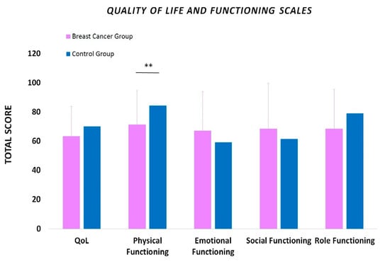 Moreover, with regard to the relationship between exercise behavior and QoL, a positive correlation was found between participation in vigorous PAs and QoL, as well as between total energy expenditure and physical functioning in women with BCa. These findings corroborate a large body of evidence supporting the hypothesis that a greater energy expenditure during the week leads to a better functional ability, while participation in more intense activities implies a better self-evaluated QoL [,]. Moreover, the strong positive correlations found between physical, social and emotional functioning further support previous findings that mental health symptoms and isolation are followed by a poor functional ability in cancer patients [,].