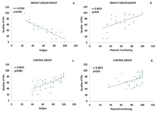 Correlational analyses revealed significant associations, among others (see text for details), between fatigue and quality of life (a,c), as well as between physical functioning and quality of life (b,d), both in the breast cancer and the control group.