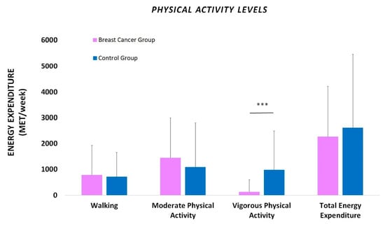 Our main findings demonstrate that women suffering from BCa and undergoing chemotherapy were willing to exercise and they participated in regular PAs, exhibiting weekly energy expenditure levels similar to those of sex- and aged-matched healthy individuals. However, they preferred to exercise in low or moderate intensities, showing significantly lower levels of MET-min per week expended in high intensity PAs compared with the healthy controls. These findings are in agreement with previous studies implying that cancer patients demonstrate lower levels of vigorous-intensity PAs post than before diagnosis [,]. Even though it has been established that high-intensity activities can safely be performed by cancer patients, offering different health benefits than those derived from the conventional exercise programs, cancer patients appear to hesitate to participate in vigorous PAs []. On the other hand, cancer-related fatigue and general pain probably exacerbate the overall burden of the disease and the therapeutic interventions, making participation in more intense physical activities difficult, especially for those patients with more advanced stages of the disease.