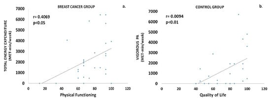 Correlational analyses showed significant associations, among others (see text for details), between (a) total energy expenditure and physical functioning in the breast cancer group as well as between (b) the engagement in vigorous PAs and the quality of life, in the control group.