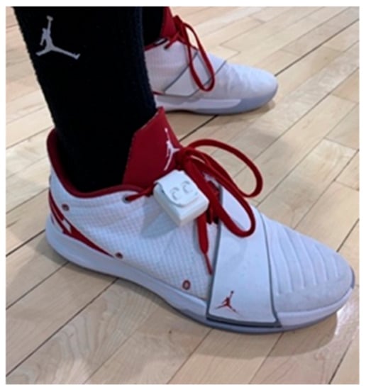 Participants wore the IPS sensor (ShotTracker, Mission, Kansas, United States) fastened to the shoe in a protective rubber sheath, looped around the shoelace (Figure 2). In unison with the IMU data collection, monitoring began when the athlete took the court for pre-practice warm-ups, where the sensor on the shoe could be synchronized with the nodes on the ceiling, orienting the unit on the area of play. All data were analyzed and exported using the ShotTracker software (ShotTracker, Mission, Kansas, United States). The variable of interest was Distance traveled (Distance) throughout the duration of practice.
