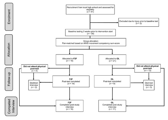 This investigation assigned participants to one of two physical preparation intervention groups in order to explore the effectiveness of the delivery methods. Two groups were prescribed matched, twice-weekly training sessions (each 25–30 min) via two delivery variations for 16 weeks. At the start of each week, group one (F2F) was offered one session face-to-face in the school’s lunch break and a second session from an online, web-based platform (details below). The second group (OL) were provided the same two sessions to complete but solely instructed only from the online resource and to be completed in location and time of their choosing. We used a sequentially designed mixed-methods approach to augment the physical competency and capacity results of the intervention, with the qualitative perceptions of the participations [24]. By combining qualitative interview data with quantitative testing results, we were able to explore the subjective context of compliance rates and provide evidence-based recommendations for future research in this area.