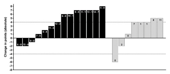 The absolute change in the Athlete Introductory Movement Screen (AIMS) sum score for the face-to-face group (black bars) and online prescription only (grey bars). Numbers within each black bar indicate training sessions completed from a possible 16 face-to-face sessions (first number) or 16 online sessions (second number). The number within grey bars indicate the number of self-directed sessions completed from a possible 32 prescribed over 16-weeks. Dashed horizontal lines indicate the smallest worthwhile change of 4 points (rounded to the nearest whole unit).