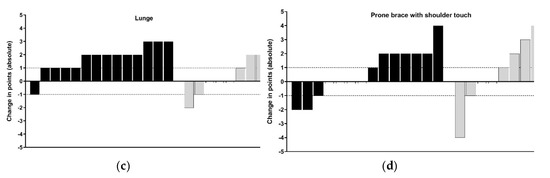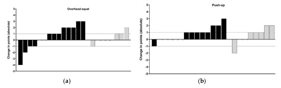 The lunge task had the greatest number of participants exhibiting positive changes (64% of the F2F group), while only three F2F and two OL participants improved in the push-up by more than 1 point (see Figure 3b,c). Thus, when low levels of training were completed, the current cohort of high-school athletes’ MC (both sum and individual task scores of the AIMS) remained within the normal scoring error reported for this tool [22]. Conversely, athletes who engaged in moderate levels of F2F sessions (see Figure 2, black bars), improved MC scores across most of the four athletic preparation tasks in 16 weeks. It is well accepted that responses to training are influenced by the intensity, frequency, and volume of training in youth [18]. Across the current intervention, the percent change from five commonly employed physical capacity assessments (detailed in Section 2.2.3, Section 2.2.4, Section 2.2.5, Section 2.2.6 and Section 2.2.7) were inconclusive, as the majority of individuals change scores sat within the SWC (Figure 4). This could be explained as a result of the intervention focus being on the acquisition and practising of correct movement techniques, rather than amassing the higher training volumes and intensity levels, the latter of which may be required to elicit improvements across muscular fitness qualities. As the present intervention had an experimental group who only had access to video demonstrations of prescribed exercises (i.e., self-coached), sessions were set at safe levels of difficulty based on observed low levels of competency at baseline. This follows the recommendations of Myer, Faigenbaum, Ford, Best, Bergeron and Hewett [3] who noted the initial volume should be low, allowing an athlete to learn the skill to perform each task with proper technique.