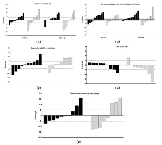 The percentage change for each physical capacity assessment for the face-to-face and online prescription (black bars) and online prescription only (grey bars) groups. (a) Triple hop sum distance; (b) star-excursion balance test’s sum of relative leg reach distance; (c) 3 kg medicine ball throw distance; (d) 40 m sprint time; (e) countermovement jump height. Dashed horizontal lines indicate the smallest worthwhile change as determined from pre-test data of all participants combined.