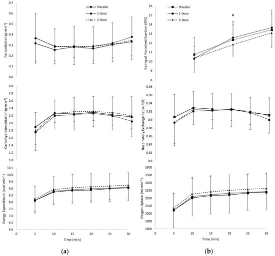 (a) Fat oxidation, carbohydrate oxidation, and energy expenditure values (mean ± SD) during 30 min of treadmill running for the placebo and supplement (one-dose and two-dose) conditions. (b) Rating of perceived exertion, respiratory exchange ratio, and oxygen uptake values (mean ± SD) during 30 min of treadmill running for the placebo and supplement (one-dose and two-dose) conditions. * Placebo and one-dose > two-dose (p < 0.0167).