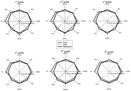 In Figure 1, the children scored below reference values on systolic blood pressure and the Andersen Test. This is because the reference values are the 90th percentile, and the scores are the median value. For the variables that use a fixed reference value: HDL, total cholesterol, MVPA, and quality of life, the scores were often better than the reference. The radar graph makes it easy to pinpoint specific variables and how the scoring of these relates to the reference and also to detect gender differences.