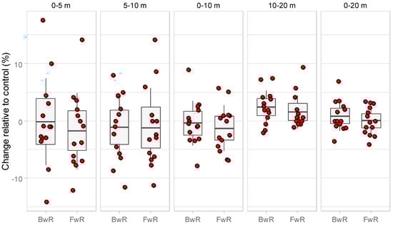 Percent change in 20 m sprint speed and its intermittent distances after the BwR and FwR protocols relative to the control protocol. Gray area corresponds to the CI95% and vertical lines to the SD of mean, shown as a horizontal line in the middle of the gray area.