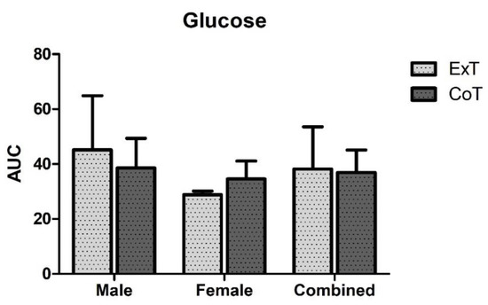 In ExT, plasma glucose levels increased 45 min following breakfast consumption (%z = −2.20; p = 0.028), immediately following exercise (%z = −1.99; p = 0.046) and 1 h following exercise (%z = −1.99; p = 0.046) compared to baseline levels (before breakfast consumption). In CoT, plasma glucose levels were increased 45 min following breakfast consumption (%z = −2.20; p = 0.028) and immediately following rest (%z = −2.02; p = 0.043) compared to baseline levels (before breakfast consumption). Moreover, pairwise comparisons showed that there was no significant difference in glucose levels at any time point between trials (Figure 1). Table 2 indicates time related changes with significant increases observed at 45 min post-meal following the exercise and control trials, immediately post-exercise/control and 1 h post-exercise. Moreover, no difference in glucose area under the curve (AUC) between trials or gender was observed (Figure 2).