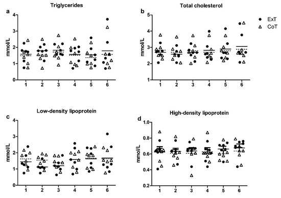 Changes in plasma lipid levels following exercise (ExT) and control trial (CoT): (a) Triglycerides; (b) Total cholesterol; (c) LDL: Low Density Lipoprotein; (d) HDL: High Density Lipoprotein. Time points: (1) pre-meal; (2) 45 min post-meal (pre-exercise/control); (3) immediately post-exercise/control; (4) 1 h post-exercise/control; (5) 2 h post-exercise/control; (6) 24 h post-exercise/control. Dotted lines represent the mean values of the Control trial.