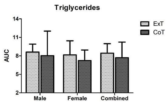Triglycerides area under the curve (AUC) in mmol/L × 24h in exercise (ExT) and control trial (CoT).