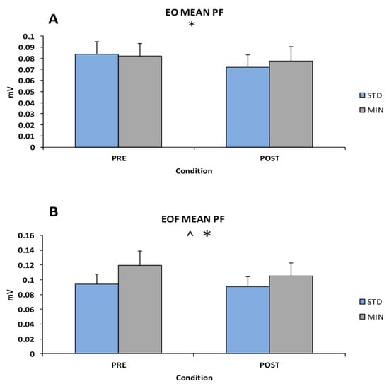 (A) Eyes-open (EO) mean muscle activity of the plantarflexor (PF) * denotes significant main effect for footwear at p < 0.05. (B) Eyes-open Foam (EOF) mean muscle activity of the plantarflexor (PF) * denotes a significant main effect for footwear at p < 0.05 and ^ denotes a significant main effect for workload at p < 0.05.