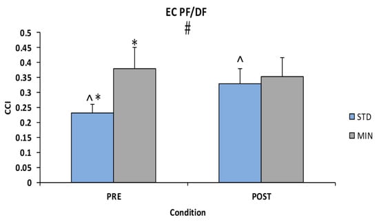 Eyes-close (EC) co-contraction index (CCI) of the plantarflexor (PF) dorsiflexor (DF) muscle pair. # denotes a significant interaction with * denoting a significant simple effect for footwear and ^ denoting a significant simple effect for time.