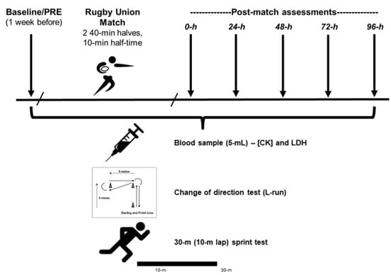 Neuromuscular performance and muscle damage markers were assessed before and for 96 h following a single, competitive rugby union match. Specifically, neuromuscular performance (speed/change of direction tests) and blood samples were assessed 1 week before (PRE) and at five times following the match; immediately post (Post/0 h) and 24, 48, 72, and 96 h post-match (Figure 1). In the week before and after PRE measurements, the participants were instructed to participate in only light training sessions/practice on 2–3 occasions. We assessed the PRE measurements 1 week prior to the match because of team logistics and schedules, and because one week was allowed for a significant recovery period to minimize interference with muscle damage markers and neuromuscular fatigue from the physical tests themselves [3,6]. The PRE measurements were done at ~17:50 with subsequent measurements scheduled at approximately the same time each day (match finished at ~17:30) in an effort to avoid differences due to diurnal variation. The order for all participants’ data collection (i.e., blood samples and physical tests) were the same across all time points and players were given no information about their data (e.g., time/performance on the tests) during the study to prevent bias [14]. During the days after the match, participants were instructed not to perform any physical exercise or engage in any formal recovery processes (e.g., stretching and massage).