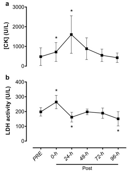 Plasma activities of (a) creatine kinase ([CK]) and (b) lactate dehydrogenase (LDH) 1 week prior to the rugby match (PRE), immediately post-match (Post) and 24, 48, 72, and 96 h post-match. Data are presented as mean ± standard deviation. *, significantly different from PRE values (p < 0.05).