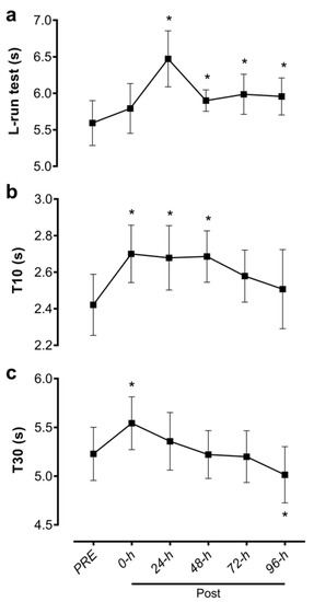 Result times for (a) L run test, (b) 10 m sprint (T10) and (c) 30 m sprint (T30) 1 week prior to the rugby match (PRE), immediately post-match (Post) and 24, 48, 72, and 96 h post-match. Data are presented as mean ± standard deviation. *, significantly different from PRE values (p < 0.05).