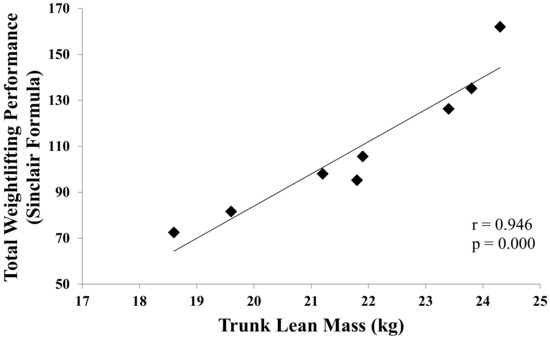 Correlation between total weightlifting performance expressed with Sinclair formula and trunk lean mass in 8 competitive female weightlifters.