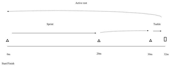 To the best of the authors’ knowledge, only three studies [8,13,14] have tried to evaluate sport-specific RHIE ability with a test design based on time-motion analysis of the game. The experimental approach consists of introducing a tackle task in an RSA test and then assessing sprint time indices as the result of the test. However, existing tests seem to have some limitations. The test proposed by Austin et al. [13] consists of a repetition of sprints (i.e., 3 × 20 m) in a first area, followed by a repetition of “sled shuttle” in a second area, which seems difficult to implement with a high number of players. Johnston et al. [8] developed a test which apparently corresponds to the training constraints, but did not assess the intensity of the tackle task during the test. It appears necessary to evaluate both sprint time and tackle intensity to better represent the demands of the game. This was the strategy adopted by Gabbett et al. [14] but the test was designed to fit the demands of rugby league matches, which are different from those in rugby union competitions [11].