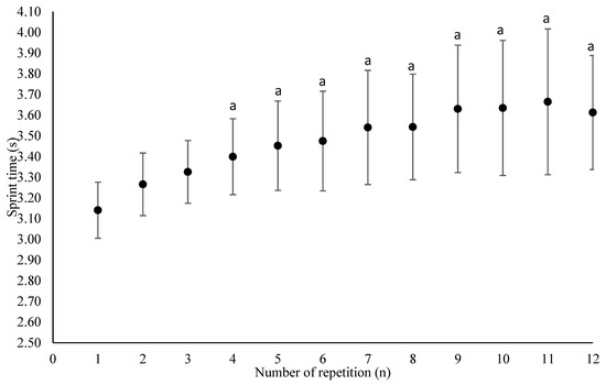 Total sprint time, (i.e., the sum of the 12 sprint times), average sprint time, and the ratio between total sprint time and the number of repetitions were computed. Fatigue was assessed by the percentage decrement score [18], calculated as follows (Equation (1)):