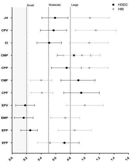 | Variable | High HDEC (n = 13) | Low HDEC (n = 14) | ES (ds) | High HBI (n = 14) | Low HBI (n = 13) | ES (ds) |