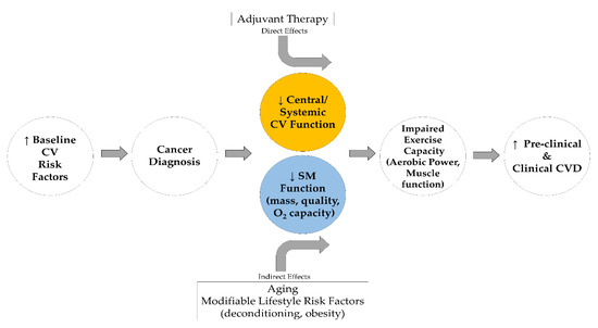Diagnostic and therapeutic advances have drastically improved breast cancer survival rates over the last half-century [1,2], yet survivors suffer from disproportionate cardiovascular disease (CVD) risk [3,4]. Breast cancer survivors have a 1.8-fold greater risk of CVD-specific mortality compared to healthy controls [3], and CVD is now the leading cause of death among early-stage breast cancer survivors over 65 years of age [5,6]. Free radical-mediated cardiomyocyte damage and the subsequent impairment of central as well as peripheral cardiovascular function are associated with two primary cancer treatments: chemotherapy and radiation [7,8,9,10,11,12]. In the case of chemotherapeutics, free-radical damage causes dysregulation of sarcomeric proteins and myocyte necrosis [7,13]. Free radical damage resulting from radiation therapy can cause coronary vascular injury, including endothelial cell proliferation, intima-media thickening, lipid deposition, and adventitial fibrosis [11,14,15]. Ultimately, these effects can lead to, among other complications, ventricular dysfunction and heart failure [9,10,11,14,16]. Though these treatments are not used solely in breast cancer and thus elicit cardiotoxic effects in other cancer populations [17], these effects may be particularly harmful in breast cancer survivors since (i) CVDs and breast cancer share risk factors (e.g., hypercholesteremia, hypertension, obesity) [18,19,20] and (ii) most women are diagnosed with breast cancer after menopause, a period when CVD risk increases due to declining estrogen [21,22]. Additionally, many lifestyle factors such as physical inactivity and obesity (which may exist at the time of diagnosis, or develop/worsen following diagnosis and treatment) influence these shared risk factors, and may exacerbate cardiotoxic effects of treatments, thereby further contributing to CVD risk [23,24,25]. Interestingly, skeletal muscle dysfunction—including reductions in mass, quality, and oxidative capacity—is also a side-effect of cancer treatment, and has been observed in various cancer types [26,27], including breast cancer [12,28]. While skeletal muscle dysfunction may be preexisting, it can also be a direct (e.g., anthracycline-mediated skeletal muscle damage) or indirect (e.g., atrophy as a result of treatment-mediated physical inactivity) consequence of traditional treatments [12,19,28,29,30]. Skeletal muscle dysfunction may be a central component linking many therapy-related toxicities and lifestyle factors with overall CVD risk, and is potentially a unique, additional contributor to CVD risk in this population [31,32].