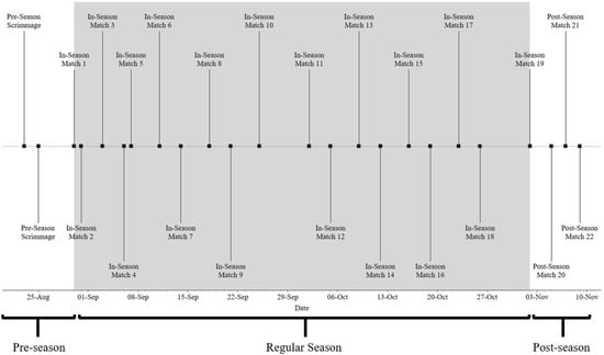 Data from 22 competitive matches collected during the 2019 competitive season were analyzed from “starters”, who were defined as those that participated in >50% of a match’s duration (Figure 1).
