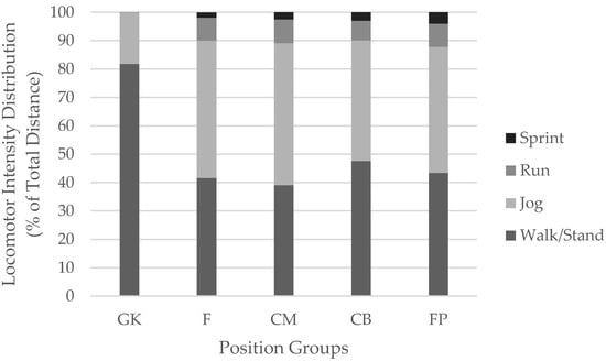 Distribution of Distance in Speed Zones. GK = goal keepers; CB = center defenders; FP = flank players; F = forwards; and CM = center midfielders. Acceleration/Deceleration thresholds: Low: ±0.5–1.99 m∙s−2, Moderate: ±2.00–2.99 m∙s−2, High: ±3.00–50.0 m∙s−2. The following thresholds were used for determination of speed Walk/Stand: <6.99 km·h−1, Jog: 7.0–14.99 km·h−1, Run: 15.0–18.99 km·h−1, Sprint: >19.00 km·h−1.