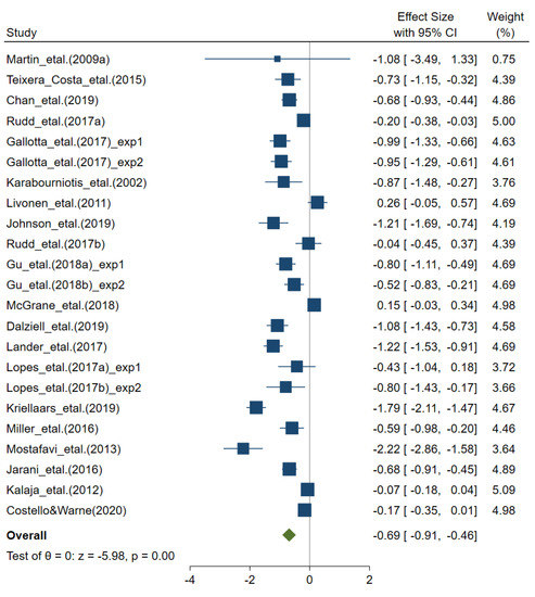 - Borenstein, M.; Hedges, L.; Higgins, J.P.T.; Rothstein, H. Introduction to Meta-Analysis; Wiley: Hoboken, NJ, USA, 2009. [Google Scholar]