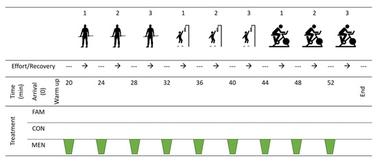 This study employed a randomised crossover design with respect to solution administration; however, performance testing order was kept consistent for all participants to minimise unexplained variance due to possible inhibition or potentiation effects [19,20]. Participants were afforded a familiarisation session for all performance tests, with subsequent testing sessions (Control or Menthol) conducted in a randomised counterbalanced order. Protocols used during the familiarisation session were identical to testing sessions but allowed participant to establish equipment positioning and gain coaching on each test. Prior to commencing all sessions, participants were asked to refrain from alcohol and/or caffeine for a minimum of 12 h, and heavy exercise that may prevent them from producing a ‘best effort’ for a minimum of 24 h. Testing sessions were 60-min in duration and included a 10-min self-selected warm up (Activities included, cycling, joint mobilisation movements, dynamic stretching, body weight squats, submaximal countermovement jumps and cycling sprint efforts), followed by three maximal mid-thigh pulls, countermovement vertical jumps and 6-s cycle ergometer Wingate efforts. Each effort and each exercise type were separated by a 3-min rest period (as per Figure 1). Furthermore, each testing session was separated by two to seven days to allow sufficient wash-out for treatment and any associated delayed onset muscle soreness, similar to other experiments investigating similar interventions upon repeated sprint performance [21]. All procedures were conducted in a climate-controlled laboratory under thermoneutral conditions (22 ± 1 °C) at midday (12 pm–1 pm) to minimise the effects of circadian variability upon performance. Thermoneutral (<28 °C) conditions were chosen to increase the potential transferability of findings to a wider range of sporting environments. Participants provided written informed consent prior to commencing their familiarisation trial. Ethical approval was obtained from the Waikato Institute of Technology Human Research Ethics Group (Approval reference: WTFE1824062018) and the trial was carried out in accordance with the Health Research Council New Zealand ethical guidelines.