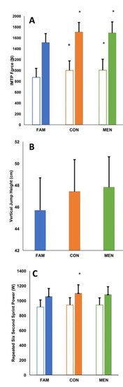 Group mean responses for peak force produced and average force sustained (Panel A) during an isometric mid-thigh pull, vertical jump height (Panel B) and peak and average power output during a repeated six second sprint protocol (Panel C). Clear bars denote average values and asterisks (*) denote a statistically significant difference to familiarisation of p < 0.05.