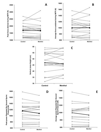 Unclear trivial differences were seen between control and menthol conditions (0.03; −0.61 to 0.67; p = 1.000) for IMTP peak force, with control and menthol conditions also differing trivially, but deemed unclear due to confidence interval breadth (0.01; −0.62 to 0.65; p = 1.000) for IMTP mean force production. Similarly, differences in vertical jump performance between control and menthol trials were trivial and unclear based on the confidence interval of the effect (0.05; −0.59 to 0.69; p = 1.000). Peak power output attained during the repeated six second peak power protocol was trivially different between experimental conditions (0.06; −0.58 to 0.70; p = 0.486), but broad confidence intervals rendered the effects unclear, likewise with respect to average power sustained over the six second trial(s) (0.00; −0.63 to 0.64; p = 1.000). Group responses are depicted in Figure 2, with individual responses shown in Figure 3.