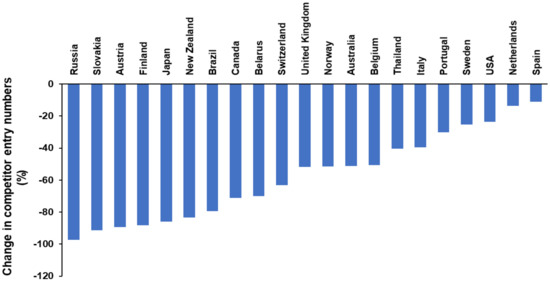 Number of documented competitor entries, regardless of organization, for each country from the 1 January 2020 to 2 May 2020 compared to same dates in 2019 (sourced from [21]). Countries where results were not available for both years or were deemed incomplete after manual inspection were omitted.