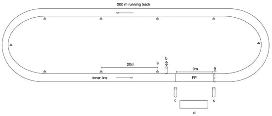 MAS test protocol on a 200 m indoor track. The symbol a represents the start line, b is a photoelectric cell to reset the force platform records, both c are the two motion analysis sensor modules, d is the control panel and e are the cones laid every 20 m and is the force platform recording area.