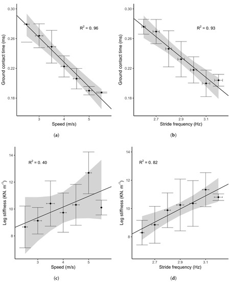Linear relationship (Figure 2) between both GCT, speed and stride frequency were in agreement with the literature [38,45]. The leg stiffness calculated following McMahon’s method [22] also reported consistent results with previous author findings [38,50,51]. Based on these results, we considered that our reference measures were suitable for comparisons with the Stryd power meter.