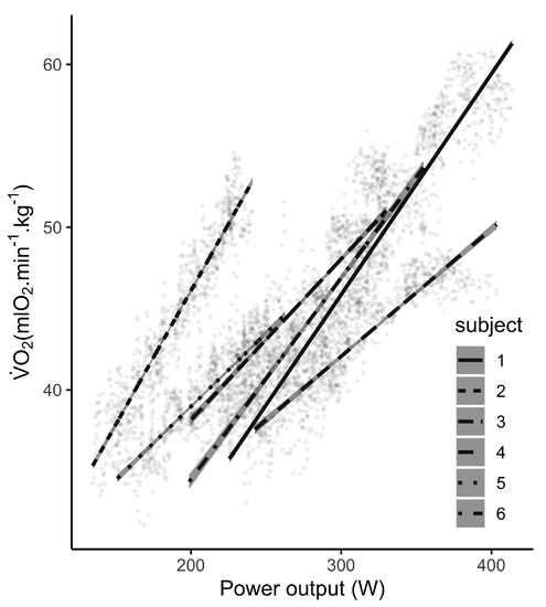 Thereafter, the effects of the system of measurement (force platform and Stryd power meter), the speed and the participant were evaluated. Due to random measurement errors and technological issues (e.g., mismatch between foot strikes and the force platform area), it has been required to deal with missing data as well as different number of repeats between systems. Consequently, a LMM was preferred to a repeated measures analysis of variance. Through a design-driven approach [35], subject varying intercept and slopes were included in addition to fixed effects. This model allowed us to consider the inter-subject and intra-subject variability (e.g., heterogeneous PO levels and individual PO kinetics in response to speed and strides changes). Independent variables were standardised prior modelling, easing the interpretation by allowing the direct comparisons of estimated parameters. The model was defined as,