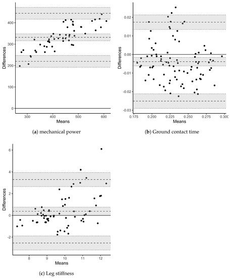 Bland–Altman plots for comparison of measurements between the force platforms (reference) and the power meter. Mean bias (middle dashed line), lower and upper limits of agreement (dashed lines) and their 95% confidence interval areas are represented.