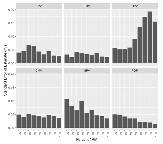 When considering all intensities, a nearly perfect relationship existed between devices for EMV, EPV, CMV, POP-100, and MPV, r = 0.92, r = 0.95, r = 0.90, r = 0.95, r = 0.93, respectively. A very strong relationship existed between devices for CPV (r = 0.78). Bland–Altman analysis indicated bias toward 3DMOCAP at slower velocities for CPV, meaning 3DMOCAP tended to provide higher CPV measurements. Conversely, the Bland–Altman analysis indicated bias toward IMU at faster velocities for MPV and POP-100 (Figure 2). The magnitudes of coefficients of variation were similar across the spectrum of intensities for EMV, EPV, and POP-100 (Table 2). Dissimilarly, the magnitude of CV for CMV and CPV increased at a greater rate in the IMU device, particularly at higher intensities. SEE revealed a substantial larger error above 60% 1 RM for CPV (Figure 3). Notably, MPV, POP-100, and EPV displayed reduced error with increasing intensity (Figure 3).