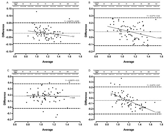 Univariate and multivariate outliers and skewness and kurtosis analyses were performed to determine if the data were normally distributed. Data were analyzed using SPSS 24.0 (IBM, New York, NY, USA) and a custom-built spreadsheet (Microsoft Excel, Microsoft, Albuquerque, NM, USA) [30]. The validity of the experimental devices was assessed against the criterion measure using LPR, expressed as an R2 value, in conjunction with 95% confidence intervals (CI) of the slope and intercept to assess fixed and proportional bias [8,15,31,32]. Moreover, 95% limits of agreement (LOA) were used to assess for systematic bias between the criterion and the other devices. Inter-day and intra-device reliability were analyzed using a combination of TE and CV.