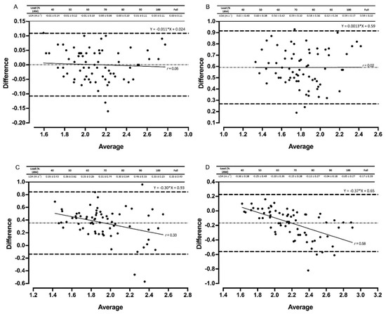 Bland–Altman plots exhibiting variation in velocity-based devices versus 3D motion capture for full datasets for mean velocity in the power clean. The mean systematic bias (dash-dot line) and 95% confidence intervals (dashed line) are displayed with the regression line (solid line) and the r value. The table above displays the limits of agreement (LOA) ± 95 % confidence intervals for each relative load. Gymaware (A), PUSHbody (B), PUSHbar (C), and Bar Sensei (D) devices are all shown.