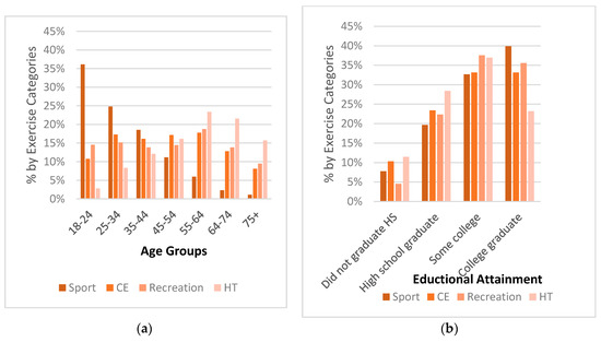 - Saint Onge, J.M.; Krueger, P.M. Education and racial-ethnic differences in types of exercise in the united states. J. Health Soc. Behav. 2011, 52, 197–211. [Google Scholar] [CrossRef]