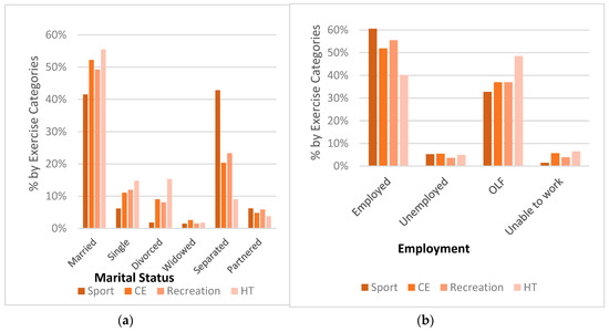 Sociodemographic Percentages for Exercise Categories: (a) Marital Status, (b) Employment. Conditioning exercise = CE; Household tasks = HT.