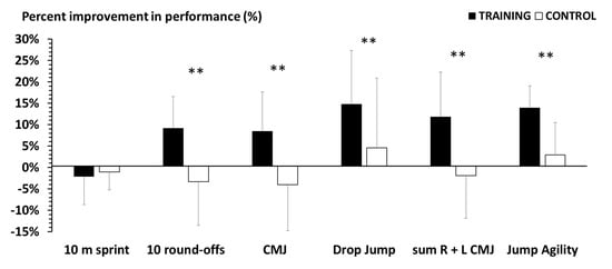 Percentage of change pre−post intervention in the examined parameters in the training and the control groups; CMJ: counter movement jump; R + L CMJ: sum of right– and the left−leg counter movement jumps; DJ: drop jump; ** p < 0.01 between training and control groups.