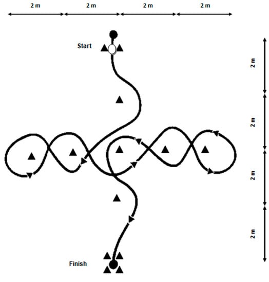 Short dribbling test was used to evaluate technical skills related to coordination and speed with ball at foot [29]. Player starts with one foot on starting line and the other foot behind it with the ball (Figure 1). Player follows a planned path consisting in dribbling a set of cones as fast as possible. A trial repetition was administered at moderate speed before starting actual test (made of two repetitions at maximum speed interspersed by ~2 min rest). The trial was not valid if player let a cone fall or followed wrong direction. The best repetition (i.e., shorter time) was used for further analysis.