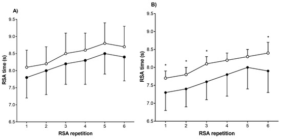 Detailed descriptive analysis of repeated sprint time between competitive level in (A) U15 and (B) U17 soccer players. Blank circles are non-selected players. Black circles are selected players. RSA repeated sprint ability, * significantly different than selected players (p < 0.05).