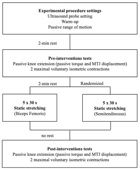 - Bouvier, T.; Opplert, J.; Cometti, C.; Babault, N. Acute effects of static stretching on muscle–tendon mechanics of quadriceps and plantar flexor muscles. Eur. J. Appl. Physiol. 2017, 117, 1309–1315. [Google Scholar] [CrossRef]