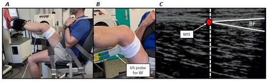 (A) volunteer positioning on the isokinetic dynamometer. (B) Zoomed image illustrating the ultrasonographic (US) probe positioning for the long head of biceps femoris muscle (BF). (C) Example of ultrasound image for the long head of biceps femoris muscle. The vertical dashed line coincides with the echo-intensive wire. The red circle (myotendinous junction, MTJ) corresponds to the junction of the superficial and deep aponeurosis.