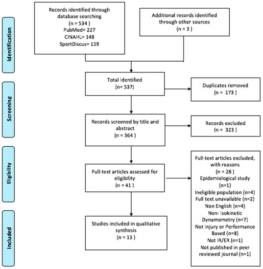 Search results were imported into the EndNote reference management software where duplicate records were removed by variations of the title, author, and date. Titles and abstracts of retrieved articles were screened against predetermined eligibility criteria (details below). Any title and abstract that did not clearly investigate the shoulder strength or endurance of athletes using isokinetic dynamometry in relation to injury were discarded as being not relevant. After the initial screening, the full texts deemed eligible were retrieved for further analysis by two of the authors. The PRISMA diagram (Figure 1) outlines the search process in its entirety.