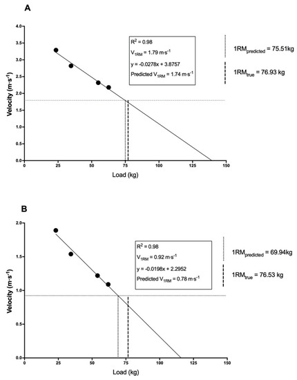 - Jukic, I.; García-Ramos, A.; Malecek, J.; Omcirk, D.; Tufano, J.J. Validity of load–velocity relationship to predict 1 repetition maximum during deadlifts performed with and without lifting straps: The accuracy of six prediction models. J. Strength Cond. Res. Publish Ahead of Print (ahead of press). Available online: https://journals.lww.com/nsca-jscr/Abstract/9000/Validity_of_Load_Velocity_Relationship_to_Predict.94425.aspx (accessed on 13 April 2020). [CrossRef]