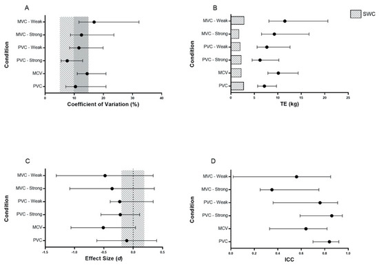Figure 2 provides a graphical representation of the CV, TE, ICC and Cohen’s d across all conditions with respect to the criterion based upon four and three points, respectively.